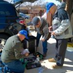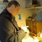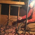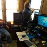 In Garage: Mike K9KQX prepped the coax 8U cables and soldered new PL 259 on ends. (Daughter Katie keeping an eye on Dad)