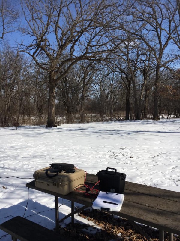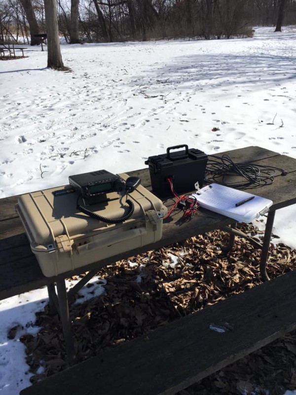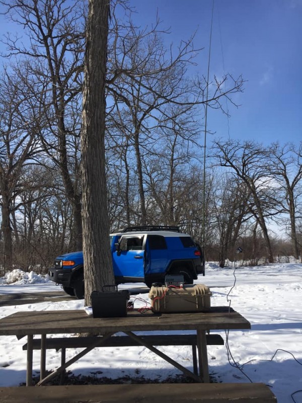 I used my FT-891, with a homebrew ammo can battery box (12v 18Ah), and a 20m LNR Precision endfed. The antenna was supported by a 31’ Jackite pole mounted to a hitch support on the back of my vehicle, and then sloped down towards to the picnic table. No need for a tuner, the antenna is resonant on 20m.