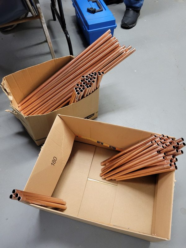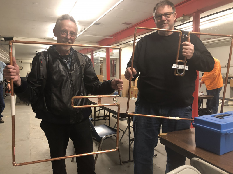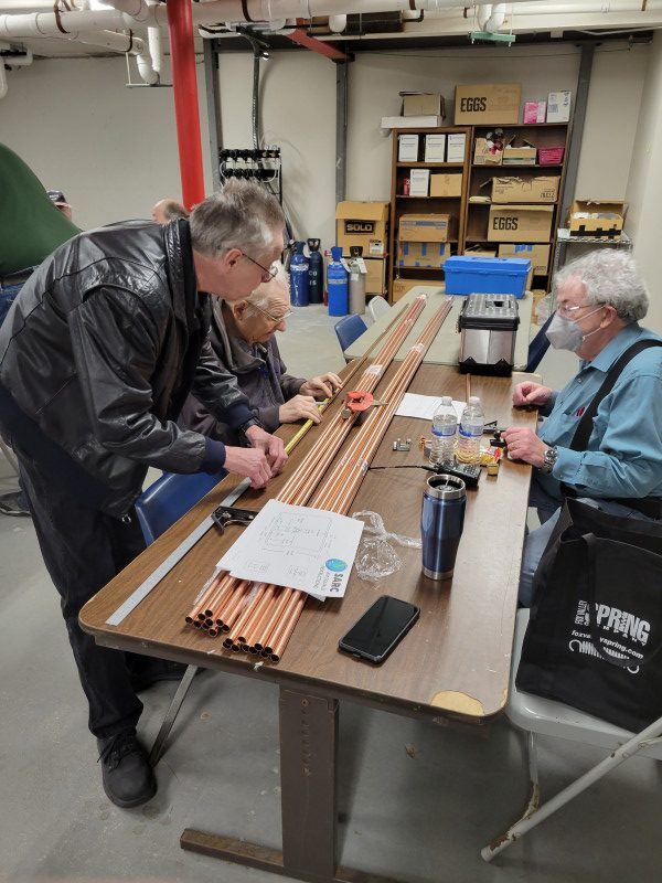 Several club members, through the Tech Net and the morning VHF roundtable advocated for several antenna projects. The problem is that good ideas need planning and execution. Prototypes need to be developed and associated costs for materials need to be estimated. A timeline needs to be developed for purchasing materials and constructing the antennas. It’s easy to say the “club should do something; what’s needed is the willingness to participate. From October of last year to this April we discussed the projects. Bates N9UVI developed a prototype of the 6M Squalo antenna and Ron Remus WB9PTA handled the precision copper pipe preparation in a fabulous team effort to supply the production floor [actually it was outside stairway railing]. But it was Cliff, Don, Robert and Ron to get the project off of “start” and scheduled for subsequent construction projects. The results were very successful.